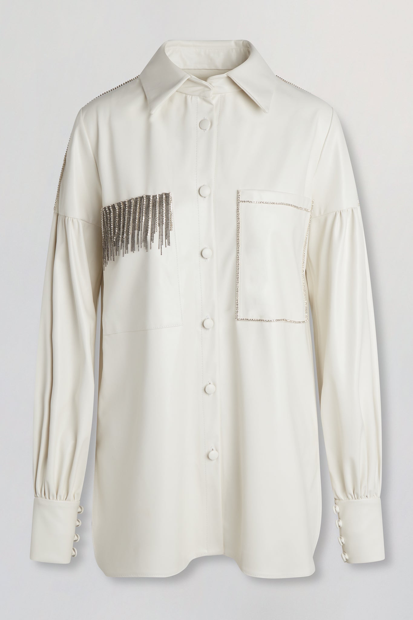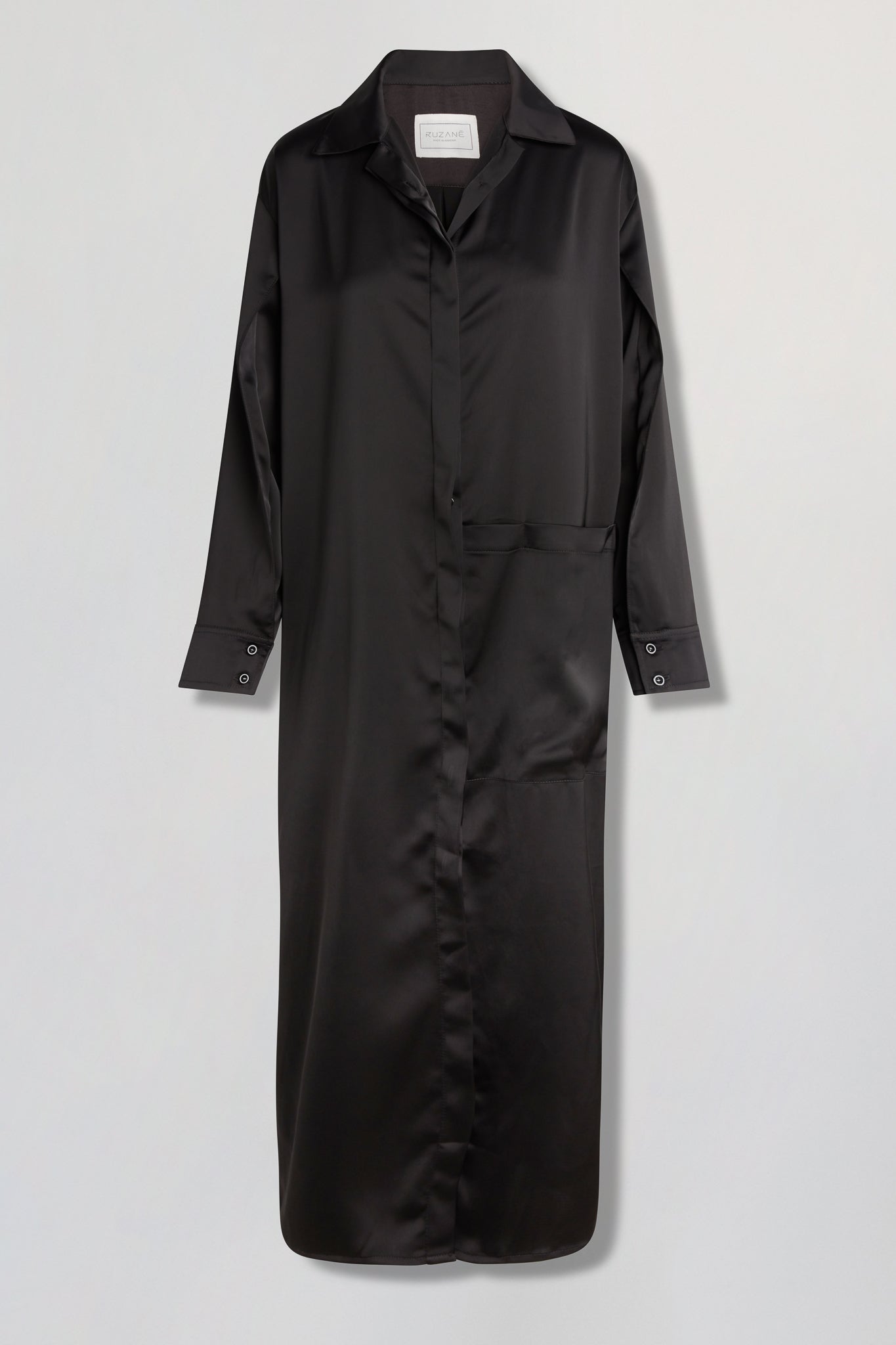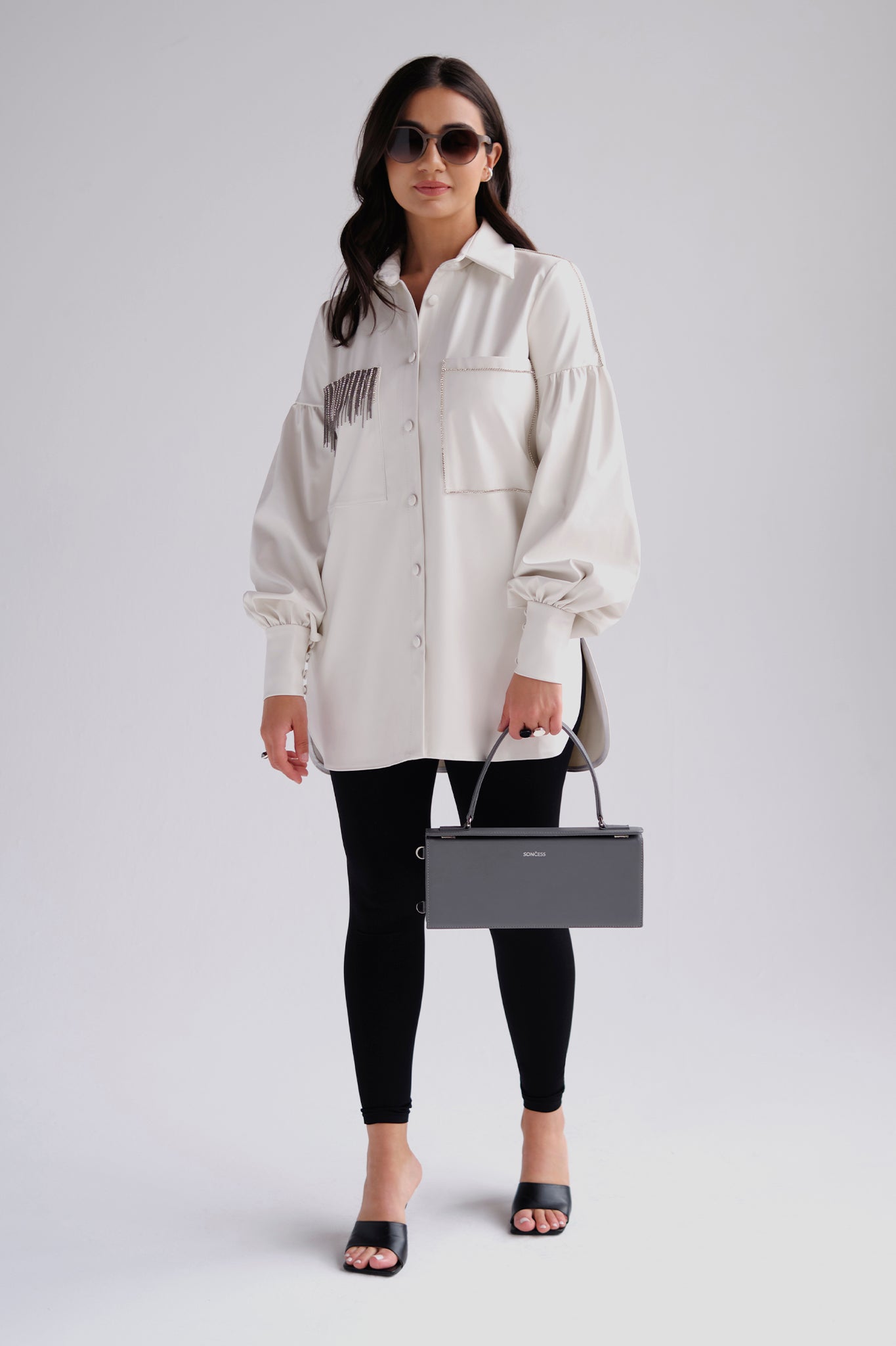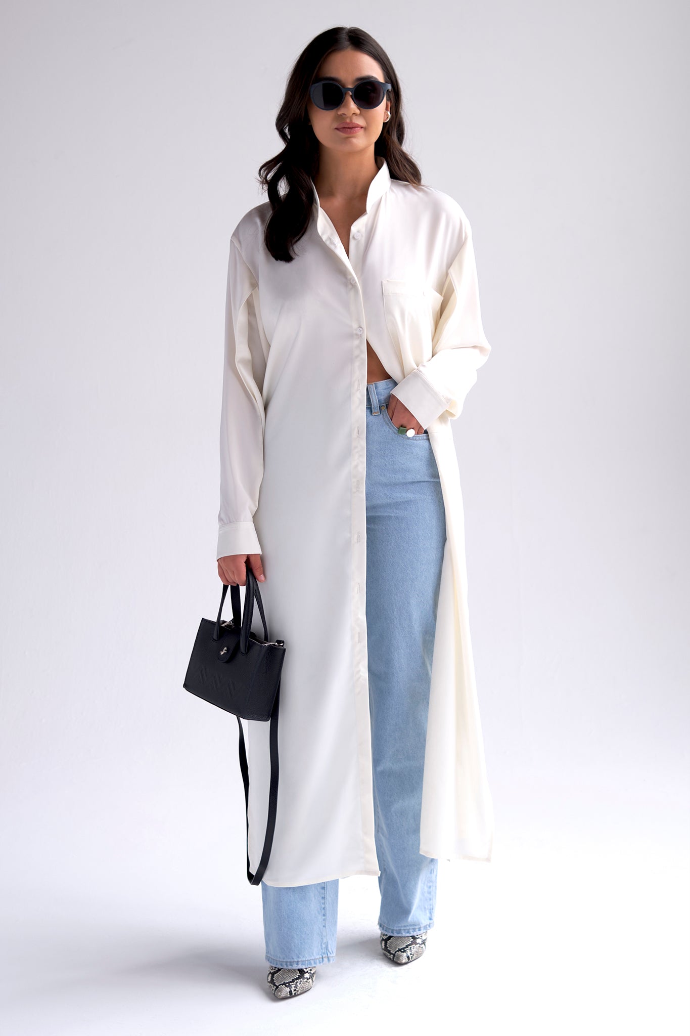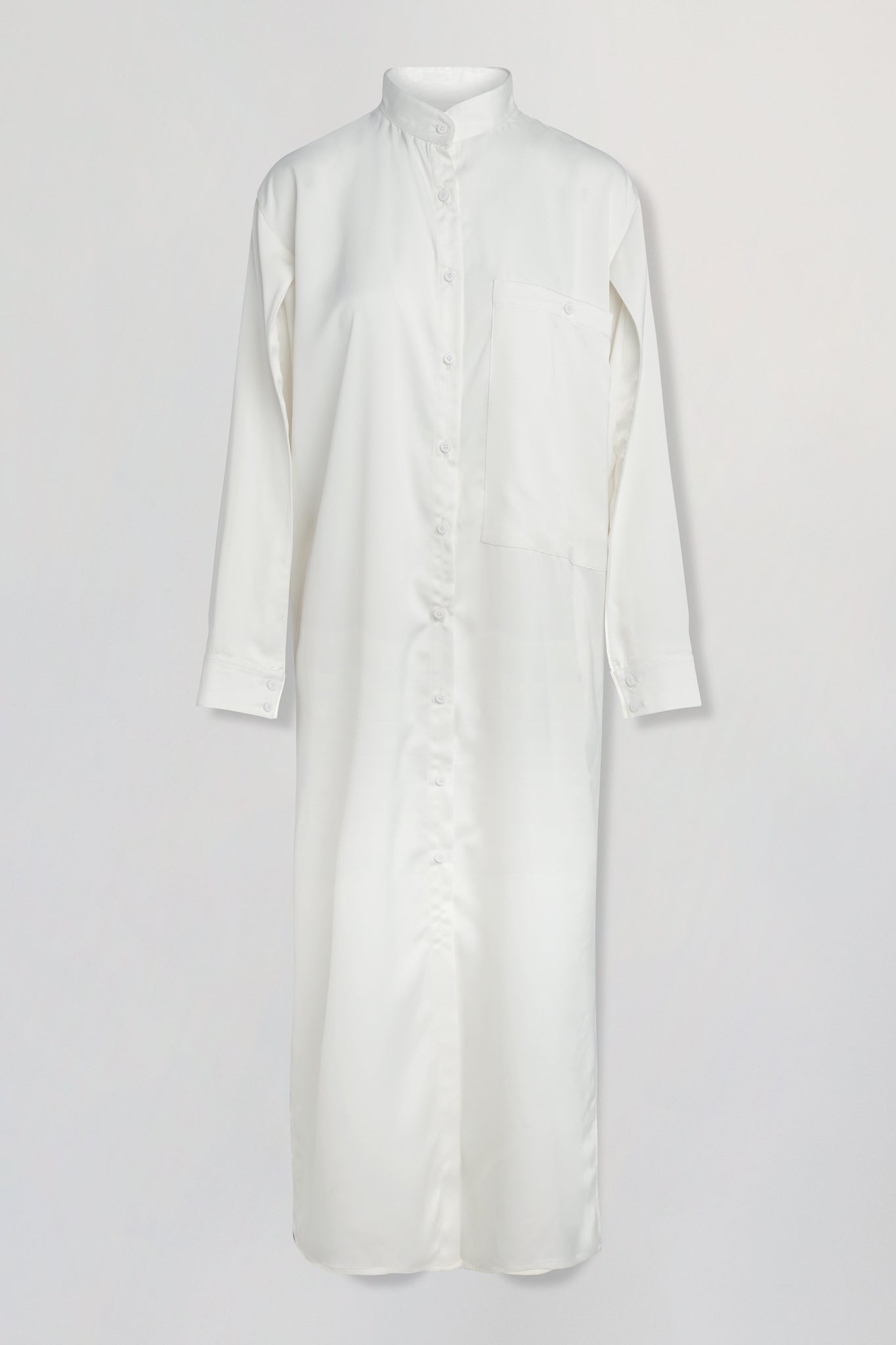 RUZANE Oversized silk long collarless shirt with high pocket in white
