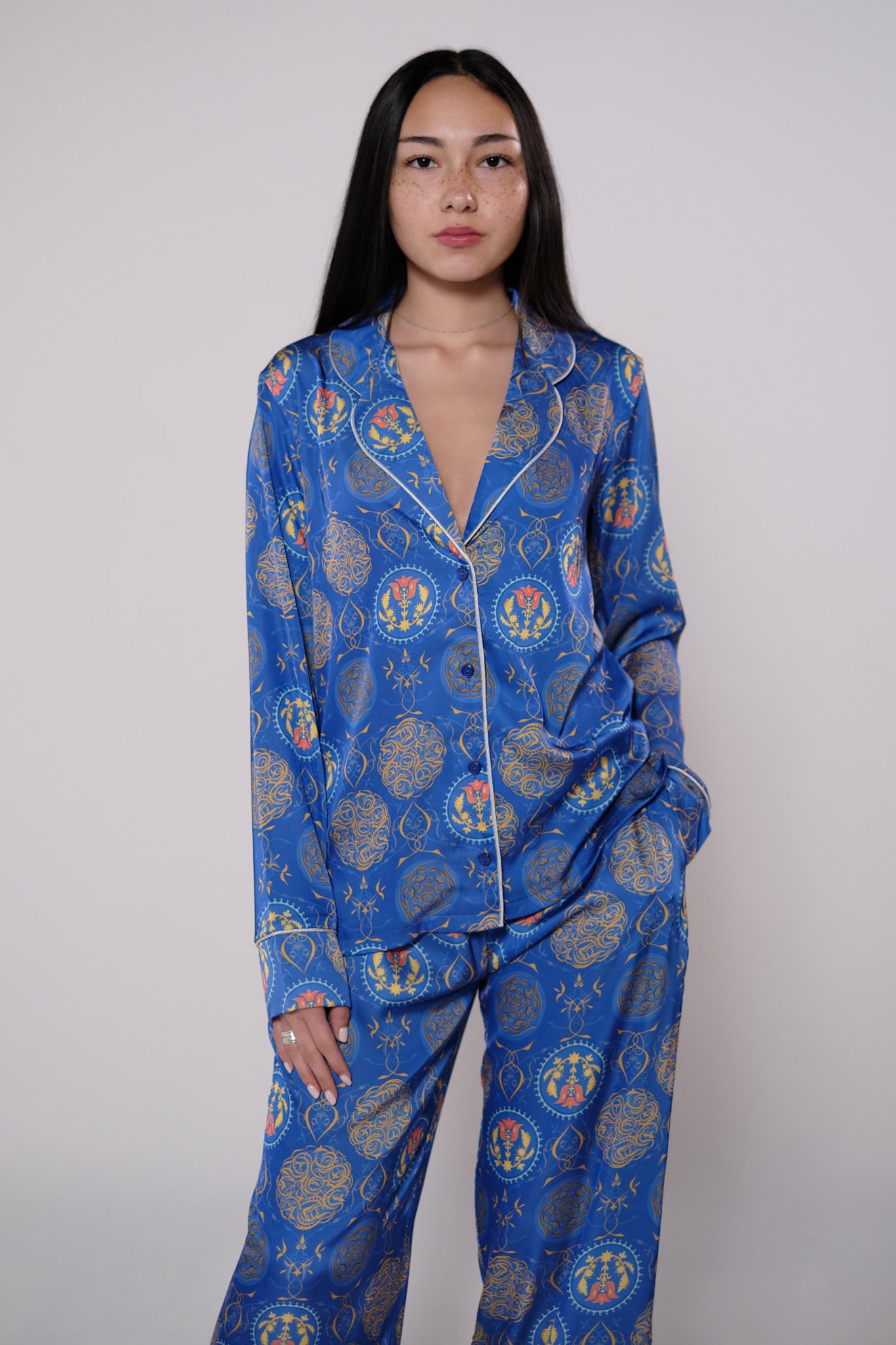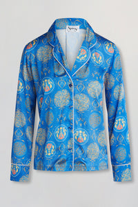 Shabeeg Satin long sleeve button down blouse in royal blue heritage print