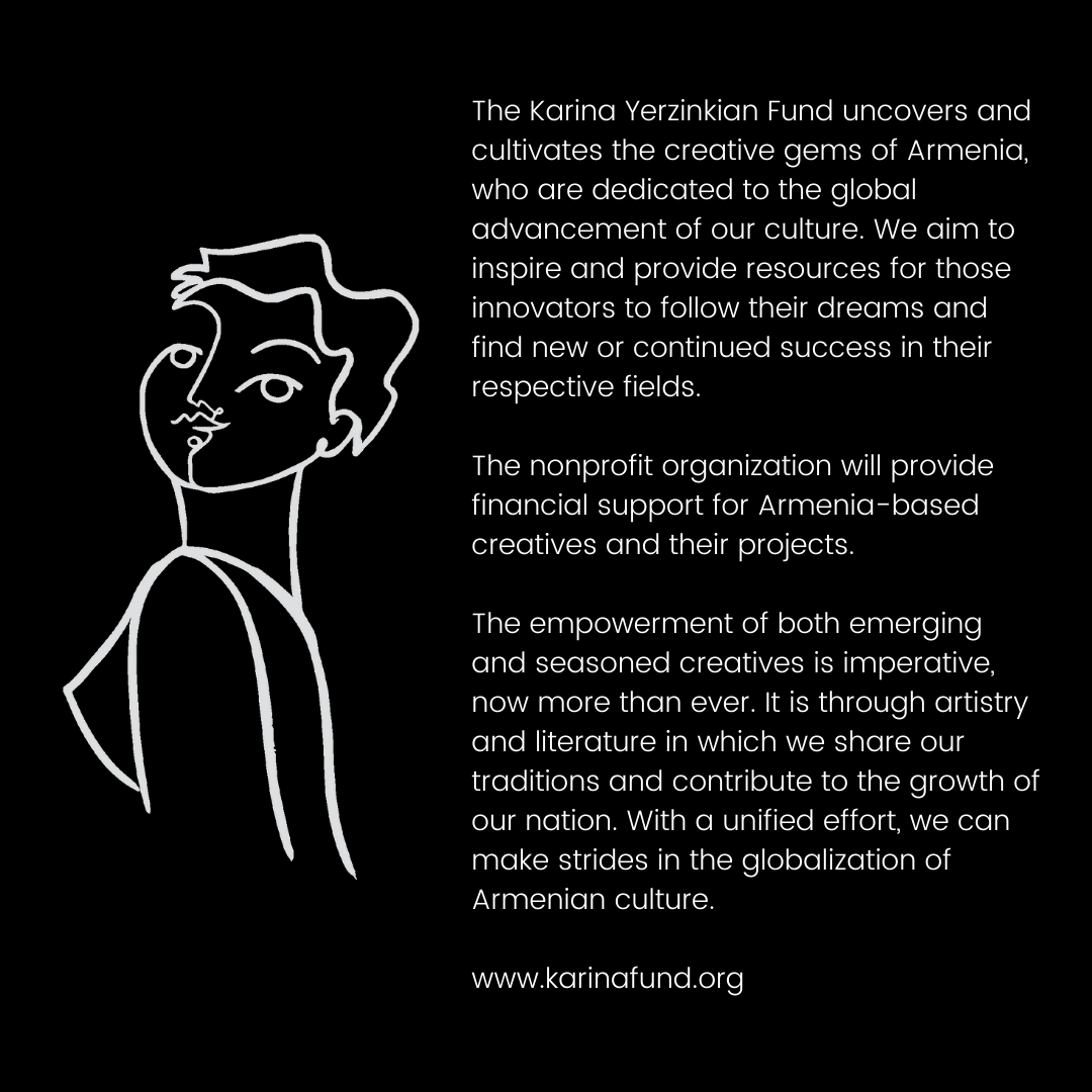 The art of fashion lends seamlessly into a variety of industries allowing for unique initiatives and collaborations. We have partnered with The Karina Fund, a non profit organization supporting creatives in Armenia, to develop programs that will support cultivate talent into new frontiers. The symbolic nature of our launch following November 9th, is not lost on us. We hope to inspire all to get involved and stay involved.